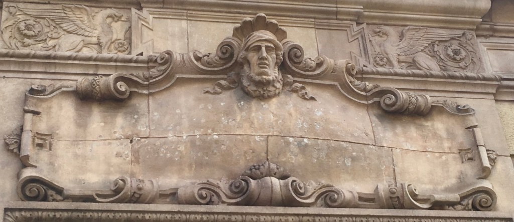 The gilded figure on the left is a generic “cartouche” that could be used on a piece of artwork (source: Dreamstime). The stone figure on the right is an architectural cartouche found in downtown Honolulu.